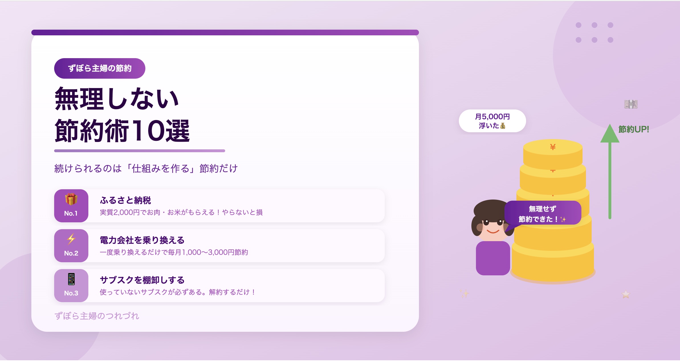 ずぼら主婦が続けられる節約の共通点は、「毎日意識しなくていい仕組み」を作ることです。